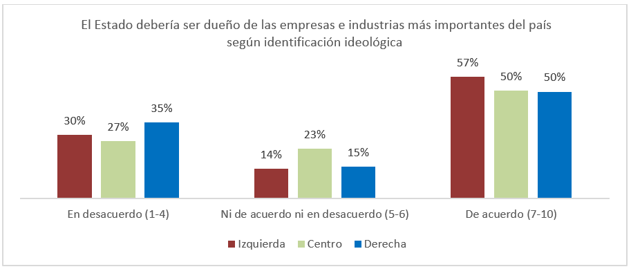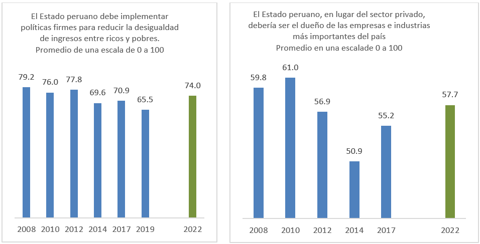 La principal demanda es que el Estado implemente políticas firmes para reducir la desigualdad de ingresos (74 puntos de promedio en una escala de 0 a 100)[1]. En menor medida, pero con un promedio por encima de la mitad de la escala (57.7 en la escala de 0 a 100) se pide su intervención como dueño de las empresas e industrias más importantes del país. Ese énfasis en la acción estatal parece haber aumentado luego de una disminución en el año 2014. Una de las explicaciones puede darse en la crisis producto de la pandemia, que ha hecho volver la mirada al Estado tanto para los temas de salud como de educación.